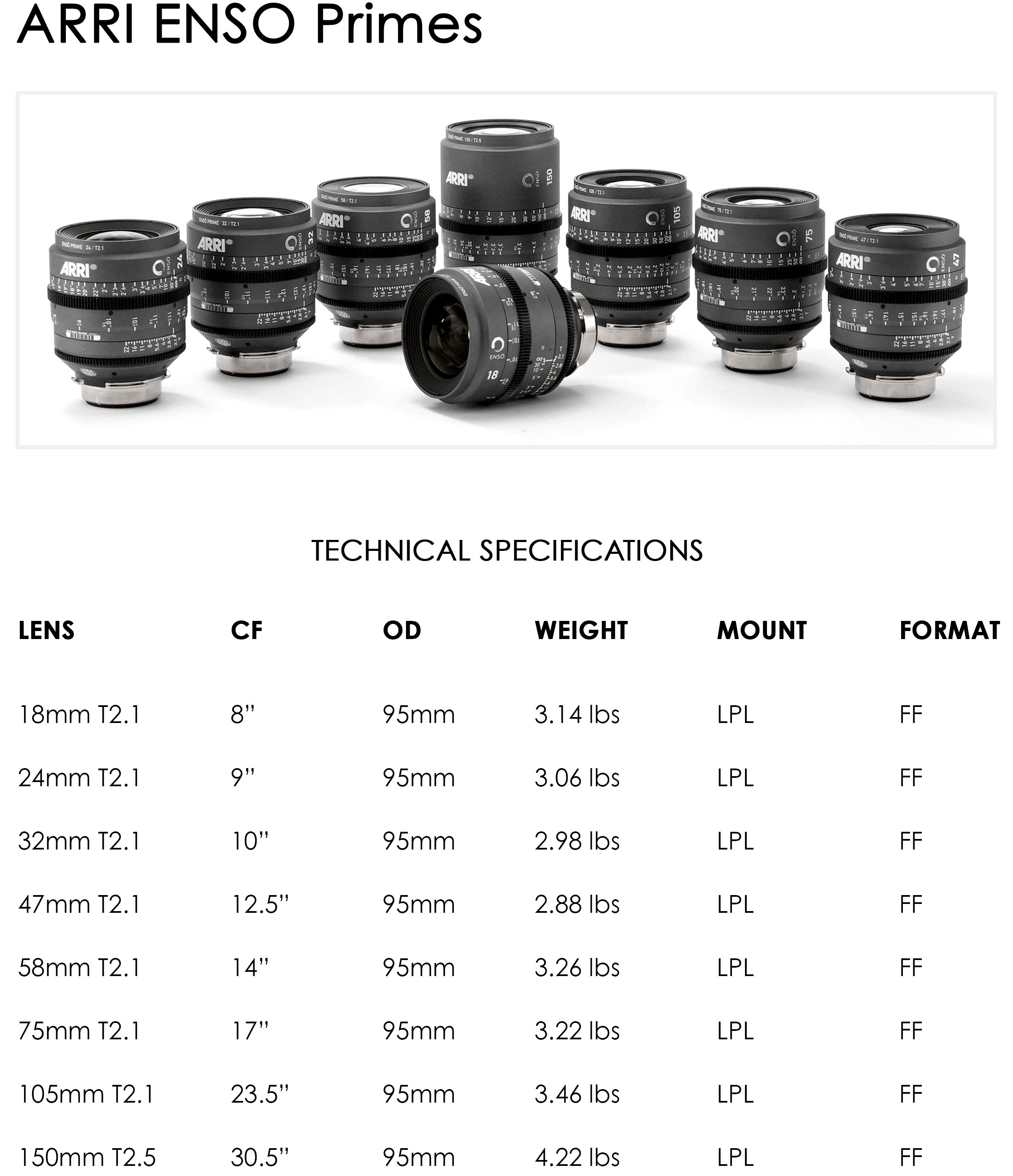 The newest lenses from ARRI, the Enso primes are very sharp, high contrast lenses with low distortion. Bokeh is very soft, flares are subtle and controlled. These lenses are smaller and lighter than the signature primes, with 95mm fronts, and LPL mounts. Many of the primes have very similar size and weight. They all focus very close, getting close to macro territory.