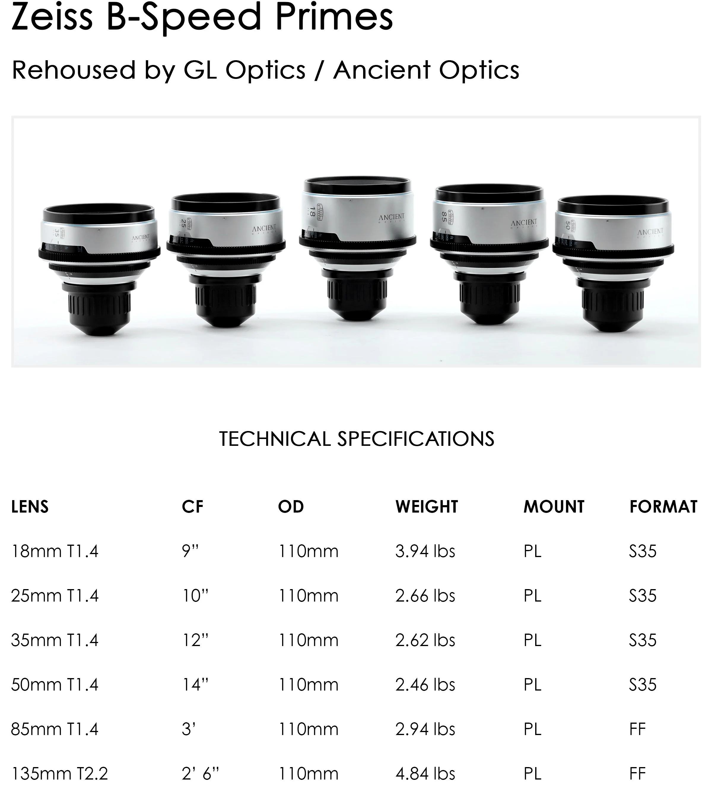 In our effort to offer only the best lenses, we now have Zeiss B Speeds rehoused by both TLS and GL Optics, both with their trademark original rounded-triangular iris. We have believed in these lenses for many years, and we were thrilled when TLS and then GL announced they were rehousing them. The new housings matching gear positions, extended focus rotation, and internal focus, making them follow focus and matte box friendly. Also, the 50mm and 85mm have improved close focus.